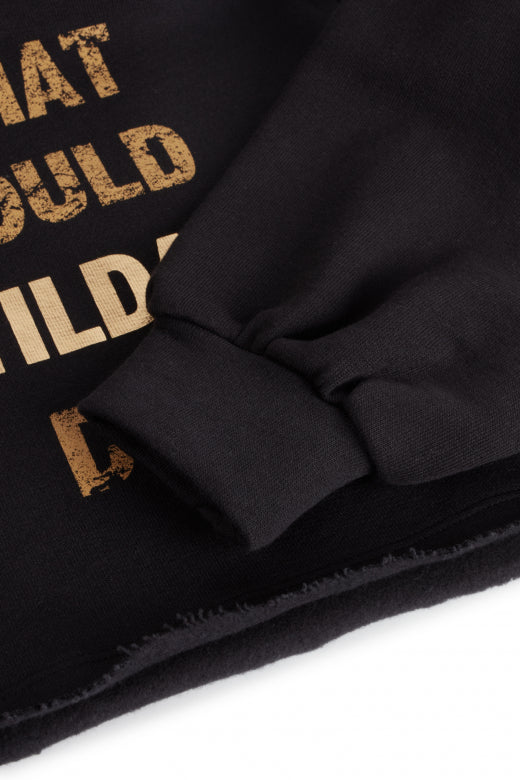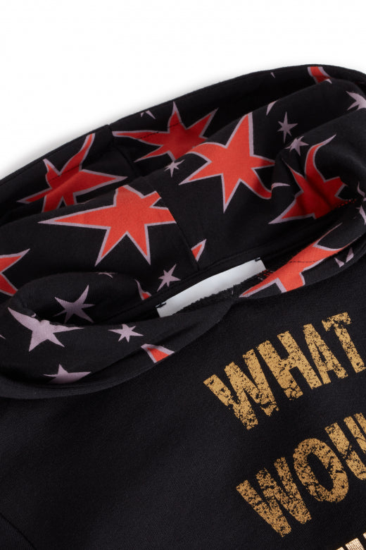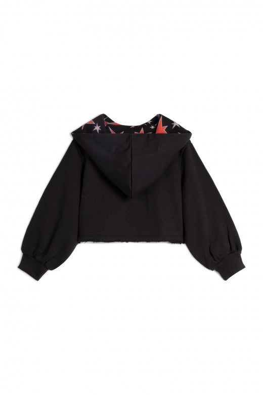 Cropped sweatshirt with long ballooned sleeves, hoodie (contrasted inner lining) and print