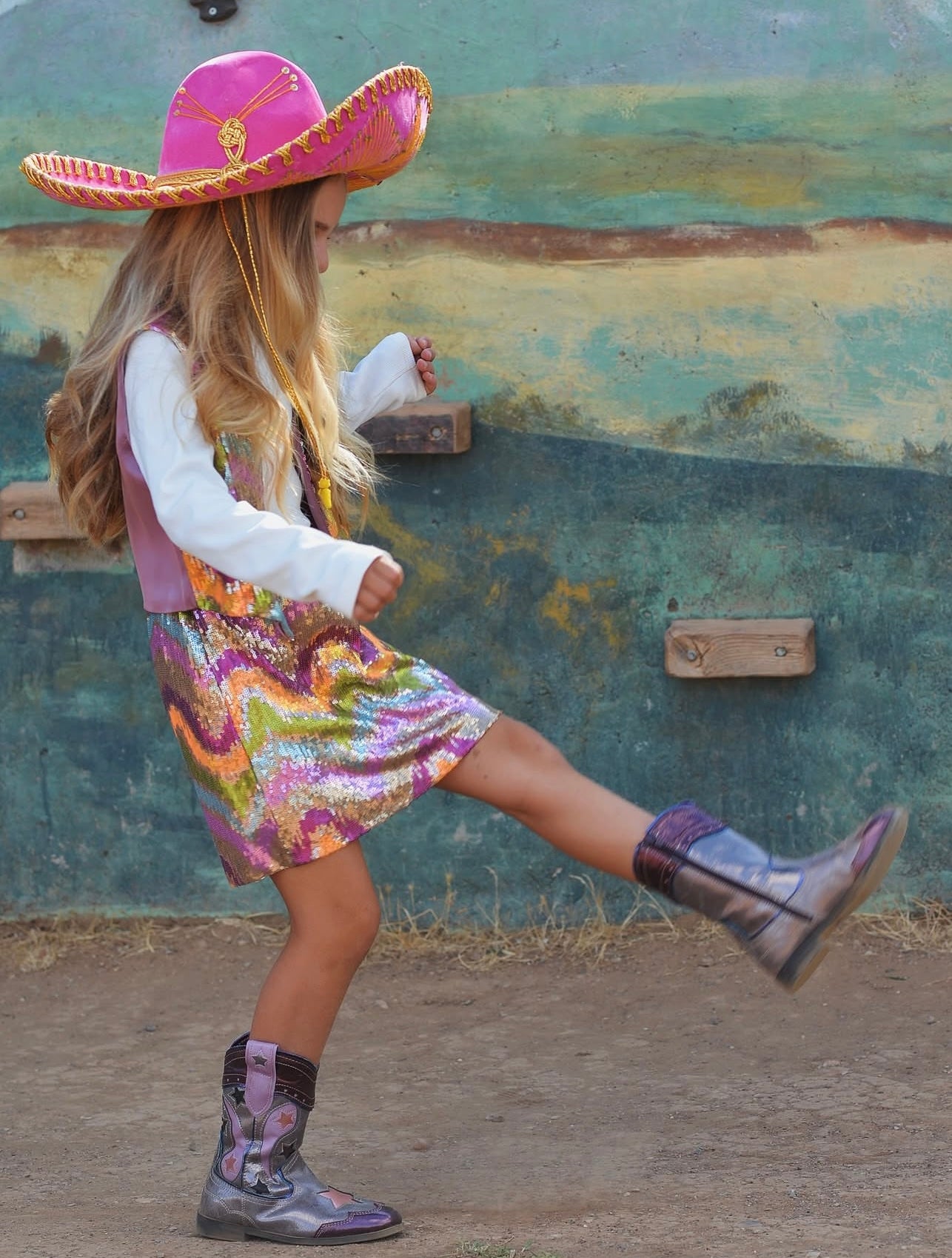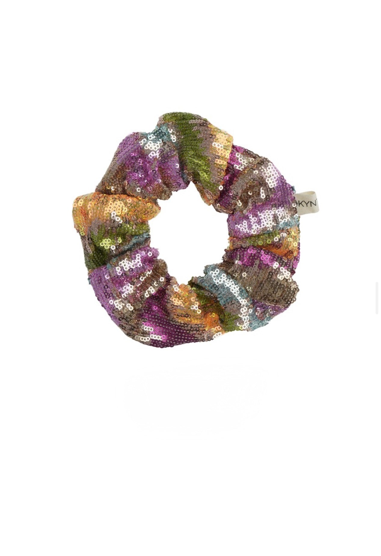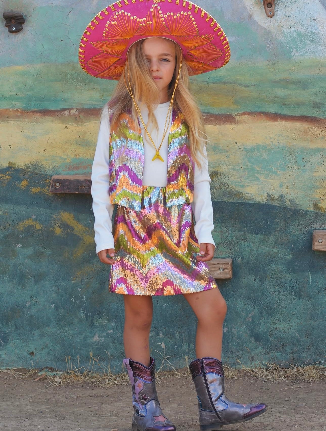 Sequins mini skirt with sequins vest & white ribbed long-sleeve top & matching scrunchie