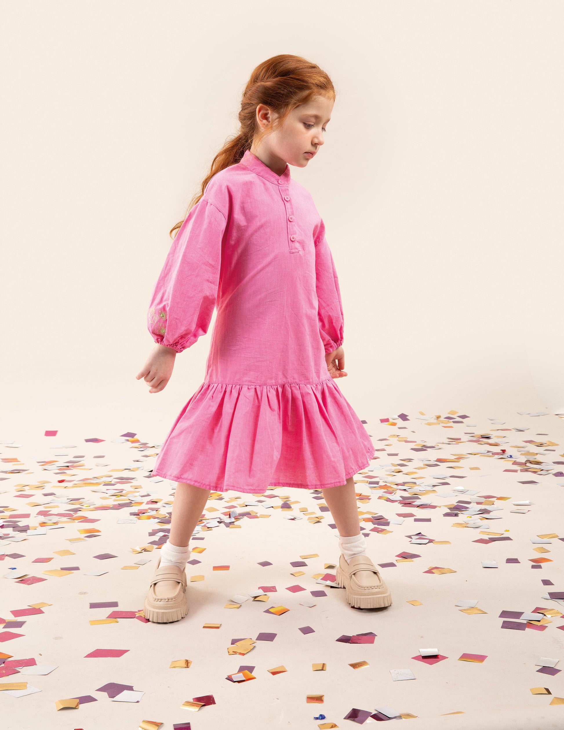Dress in plain fabric features a buttons puffed sleeves with elastic.