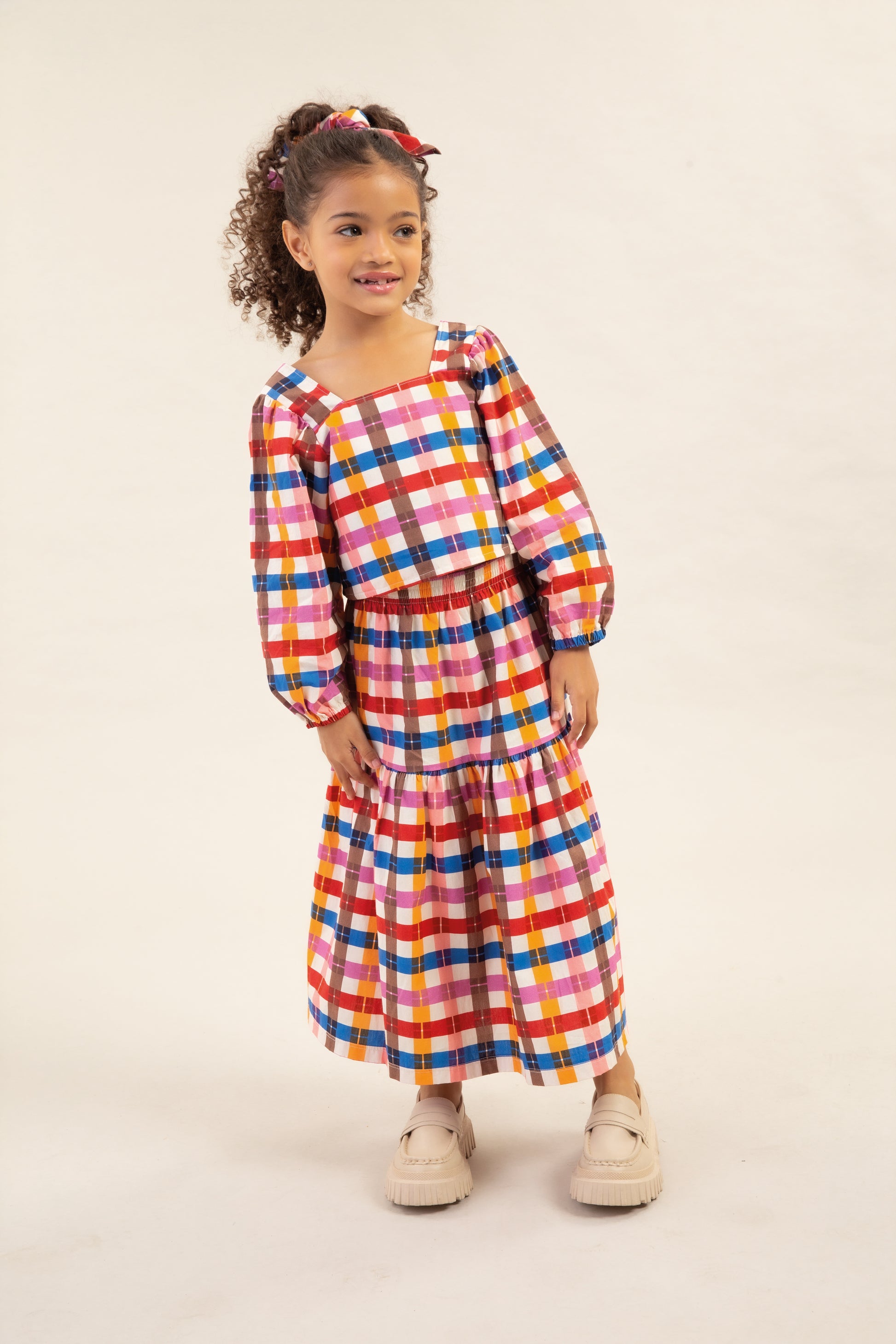 This children's blouse, made of calico, features a square neckline with a cutout at the shoulders and gathered armholes. Its sleeves are puffed and finished with elastic cuffs. The blouse's hem is finished with a standard hem, and the back features a functional opening that closes with three buttons, making dressing and changing the child easier.