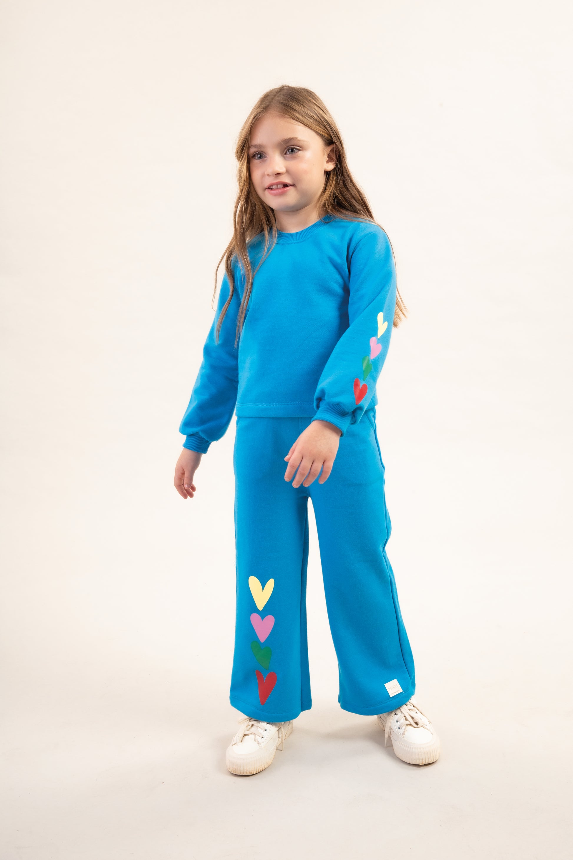 Children's cotton sweatshirt set. The blue blouse, with a plush interior, features heart prints and puffed, princess-style sleeves, adding a charming touch. The collar, waist, and cuffs are finished with ribbed trim. The pants are an off-white legging style, with a heart print all over, matching the blouse's print.
